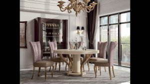 Il tavolo rettangolare Citrino con inserto in marmo Emperador Dark e gambe in ottone, si accosta alla credenza Madreperla a due ante con cassetti. La particolare decorazione della fascia frontale riprende il classico tema della collezione Aura.